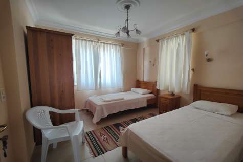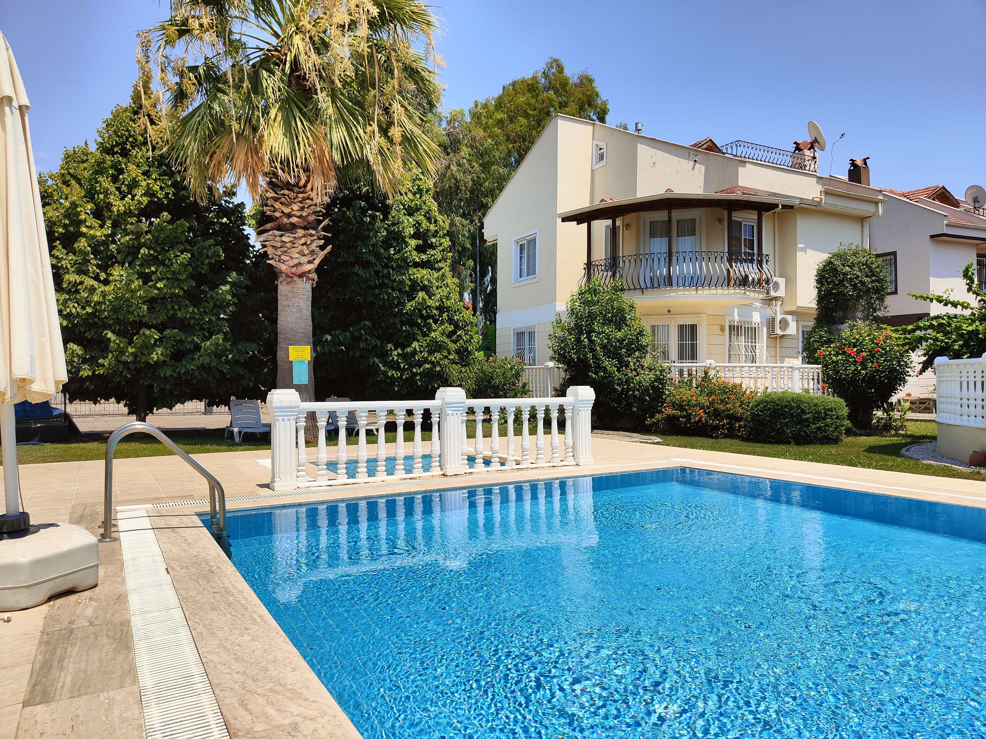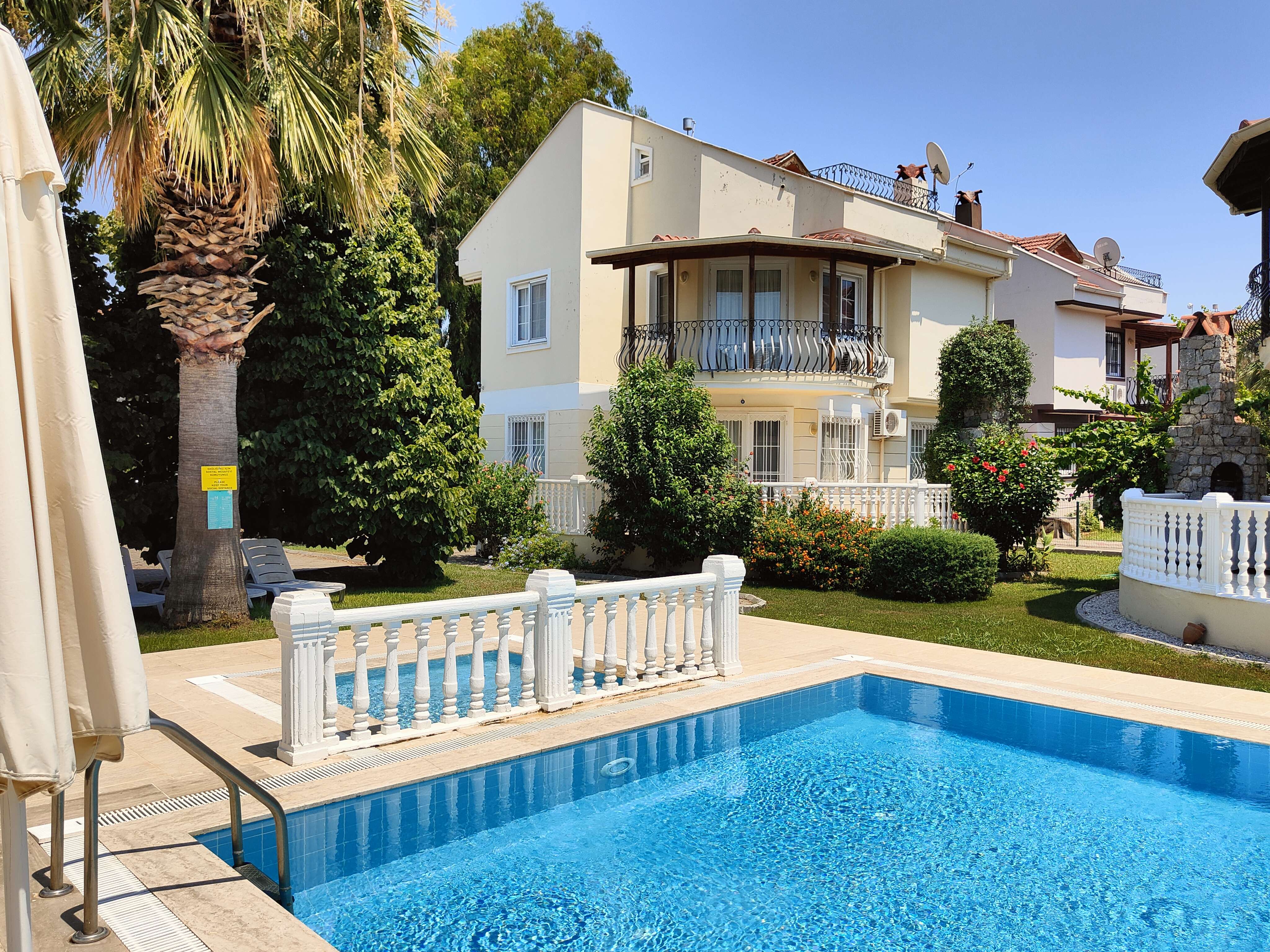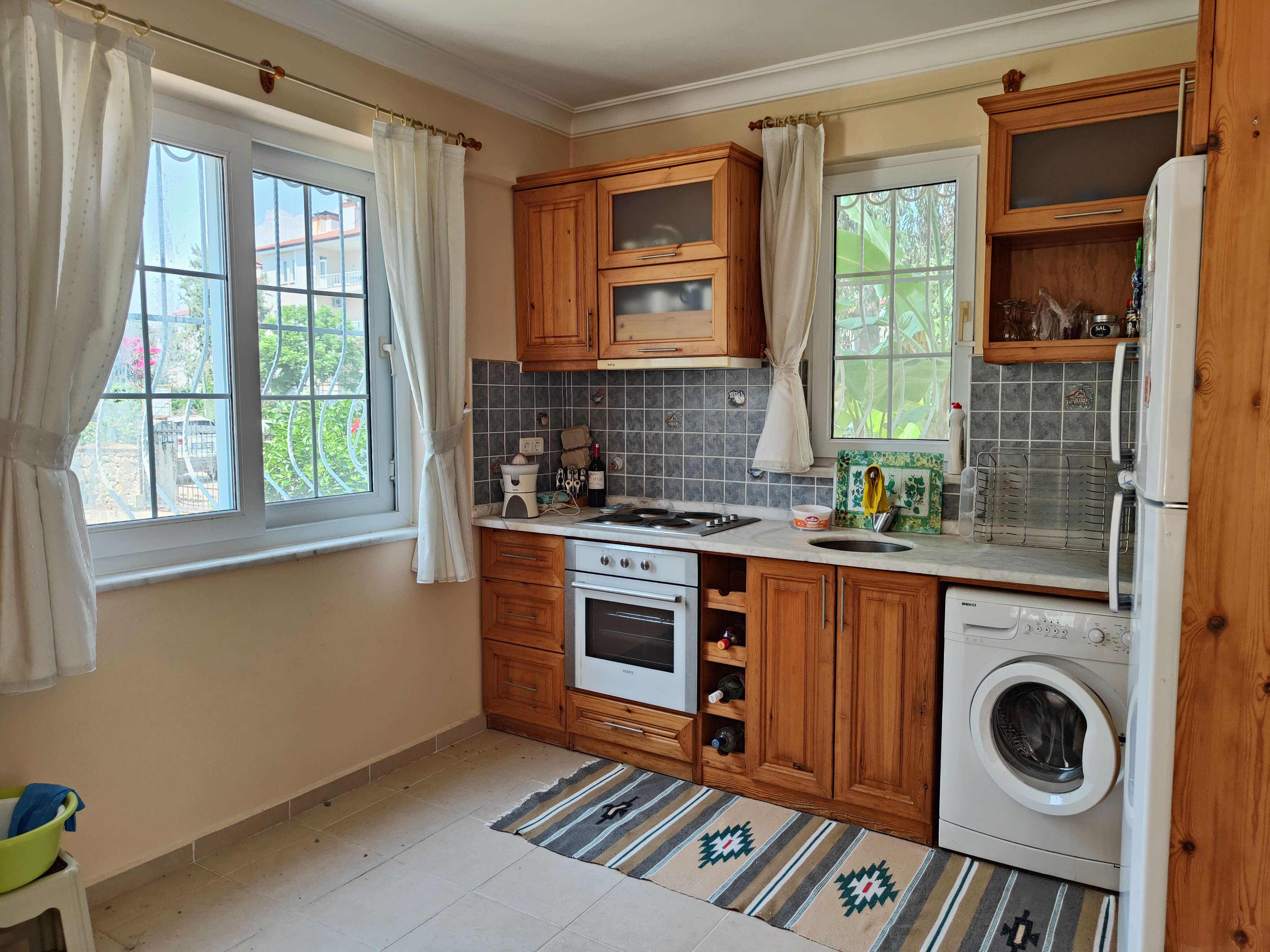Guests who want to enjoy a refreshing dip in the water can do so at the on-site shared swimming pool, which is just steps away from the villa. The pool is surrounded by a well-manicured garden featuring lawned areas, decorative plants and trees. The location of the villa presents guests with a perfect base to explore the local area, with countless opportunities for outdoor activities such as hiking, cycling, fishing, and beach-hopping. This property is no more than 650 metres from the beach and, for those of us that know Calis as an area, we enjoy the fact that the landscape is mainly flat, absolutely perfect for walking or cycling.