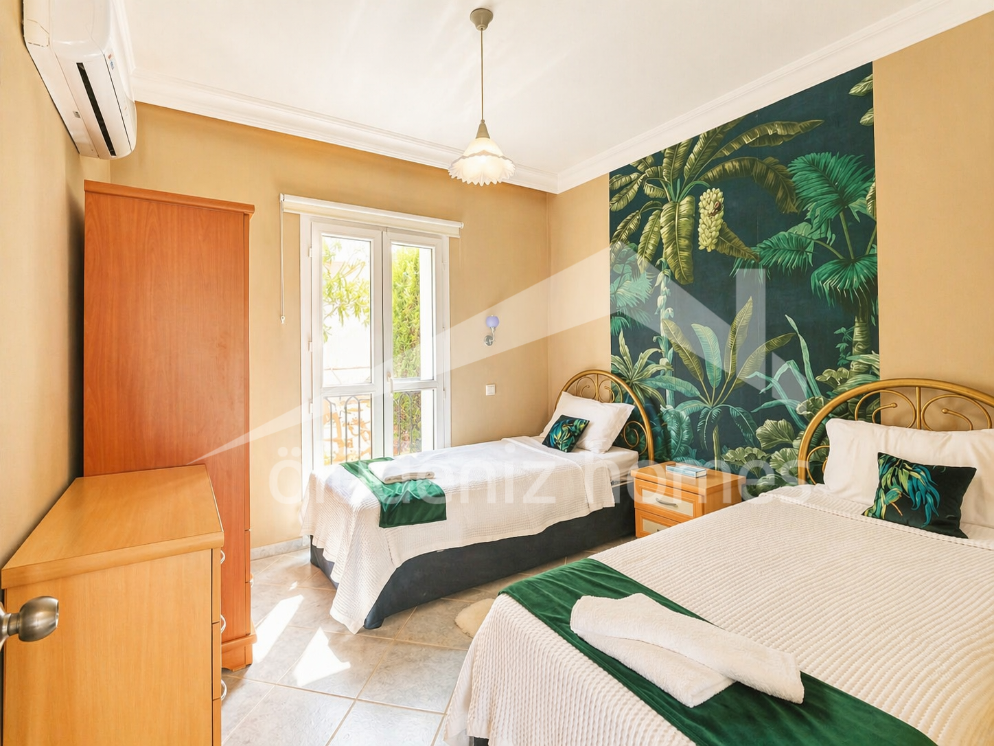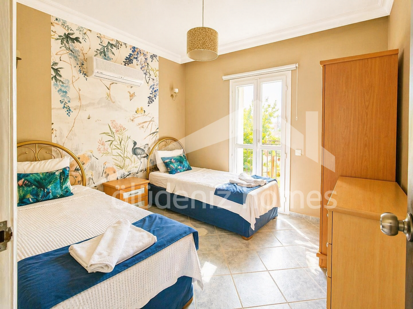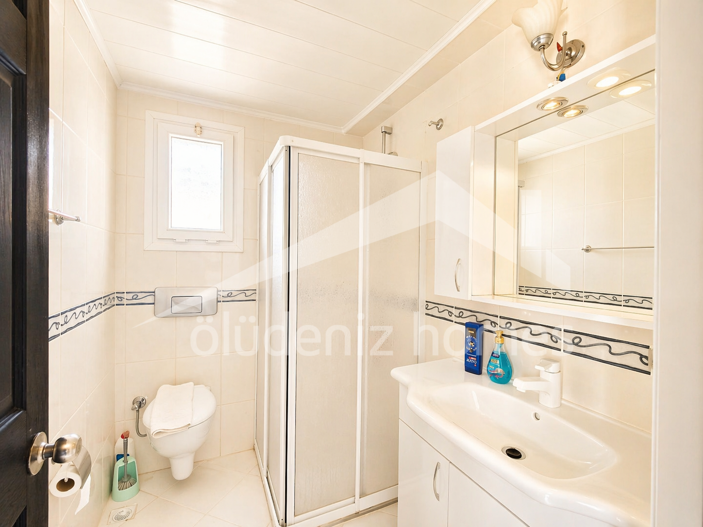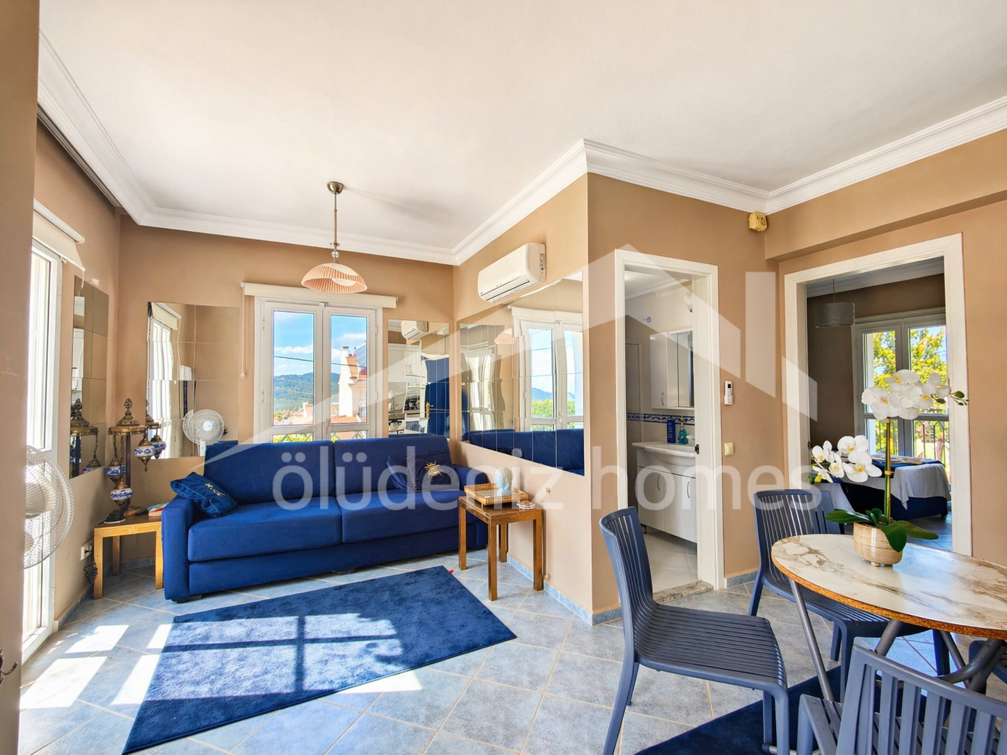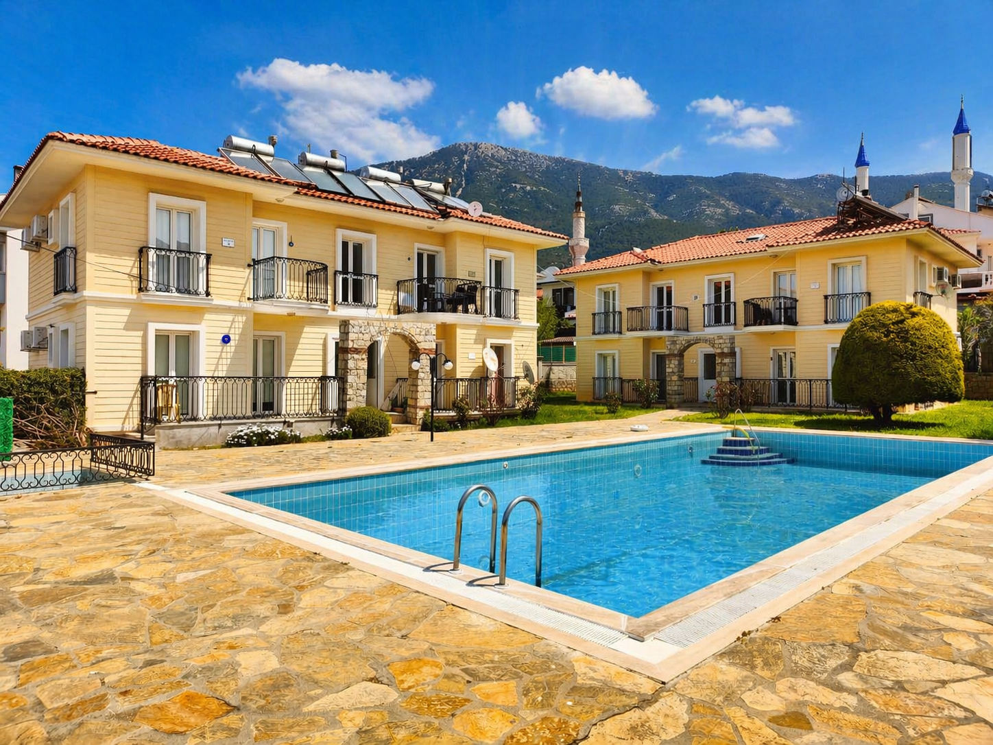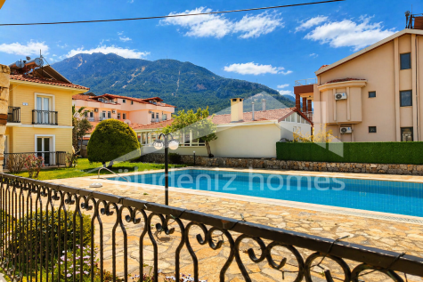 There are two private balconies, one of which overlooks the large communal swimming pool, providing a pleasant setting to unwind and enjoy the surroundings. The property also benefits from views towards the iconic Babadağ Mountain and the natural landscape of Ovacık.